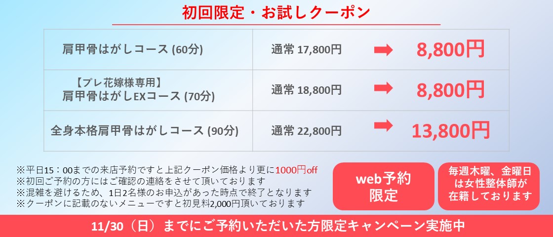 従来の肩甲骨はがしに新たに2つの施術を加えたパワーアップバーションです!